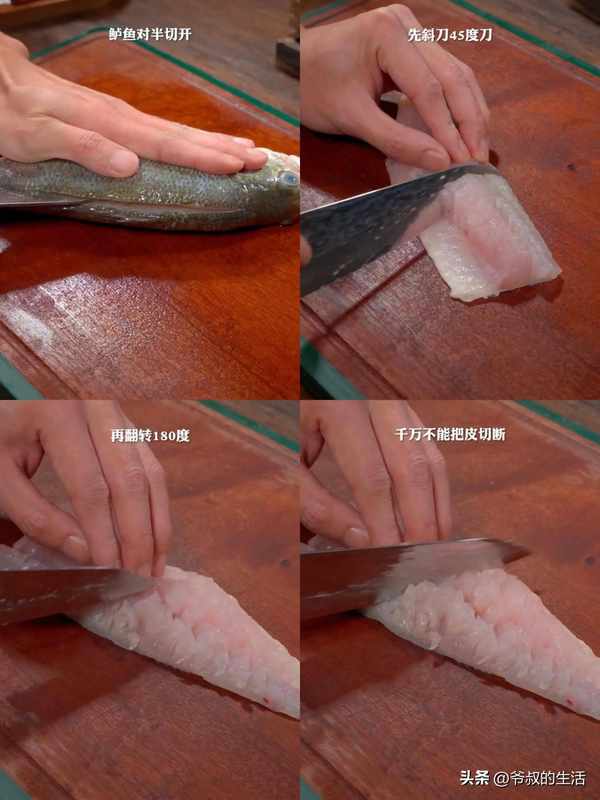 再把鱼转180度,还是斜刀切,不破皮