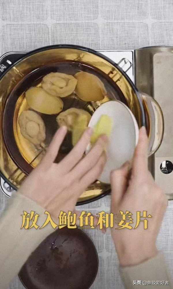 加入鲍鱼和姜片,大火煮开后,改为中火煮40分钟左右,直至熟透