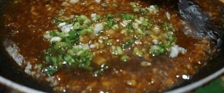 4、热锅热油爆香蒜末,蒜末炒成金黄色,把调好的酱油加入。