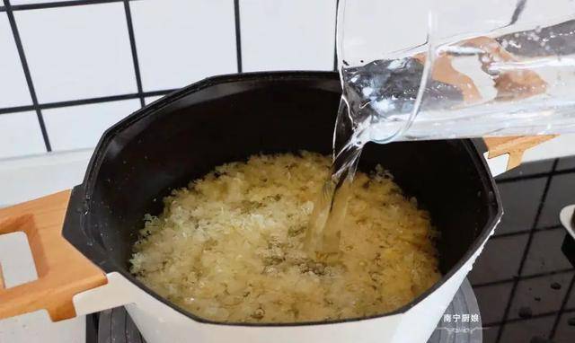 4.白蘑菇和糖都过核后,我们就可以加水开始煮了。