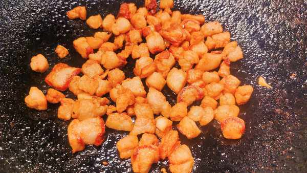 把肉切成半截拇指大小的块,洗净,沥干。锅烧热,调成中火,干锅下肉。丰满的猪肉甫一接触炙热的锅底,就快乐地发出吱吱的吟唱声,不断地激出自身的油脂,如同武侠小说里的绝世高人,遭奸人陷害身中剧毒后正用深厚的内力逼出毒素,让人很是期待山崩地裂的那一刻。在渐渐高涨的噗呲噗呲声里,猪油不断地滤析而出,浓郁的油香很快布满了整个厨房,飘散得到处都是。慢慢地,锅里熬出来的油越来越多,肉块也像排毒后精力尽散亟待修养的高人,身形越来越佝偻,颜色则由白转金黄,在油面上无力地飘来荡去。