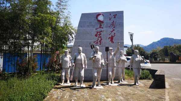 解放前的上旺村,是一个“四周环山一条溪,荒山秃林无粮地,十户人家九户穷,挑脚抬轿做长工”的穷山沟。50年代末,上旺人立志改变贫困的面貌,他们辟荒山、种茶树、建水库、改农田,硬是用八把旧锄头,征服了大大小小的山头,把原来岩石裸露、乱石成堆的荒野变成一片片绿色茶园和粮田,把一个吃不饱穿不暖的穷山沟打造成了“山上是银行,平川是粮仓”的时代新农村。上旺,因此赢得了“江南大寨”的美誉,成了当时全国艰苦创业的样板村。