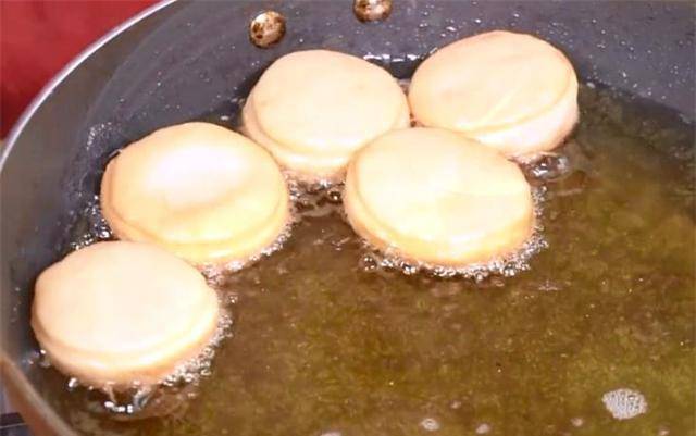 7、时间到了,就可以开始炒了。将更多的油倒入锅中,然后打开暖气加热油。我们把一小块面团扔进油锅里。如果面糊浮起,说明油温不错,可以开始煎了。转小火,然后把准备好的小圆饼沿着锅边慢慢放上,盖上锅盖,煮至底部金黄,翻过来再把另一面煎至金黄,就可以控制油了。