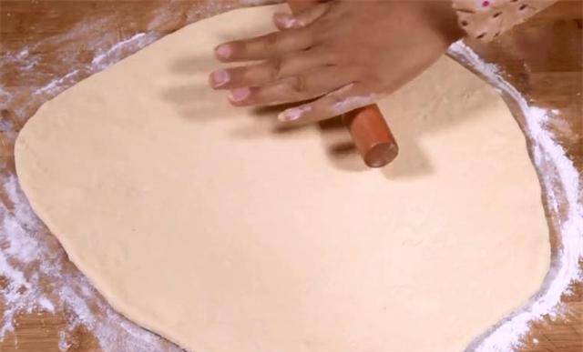 3、面团醒好后取出,案板上多撒些干面粉,以免粘连,把面团放在案板上揉,抽出空气,揉成光滑的圆形面团,用手轻轻按压,然后用擀面杖轻轻擀开。擀的时候不要太用力,因为面团太软了,就这样擀吧。