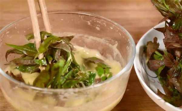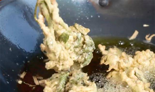 4.往锅里倒入更多的油。油温50%热的时候,就可以下锅炸了。当香椿表面呈金黄色时,就可以控油出锅了。