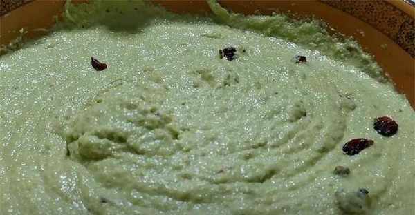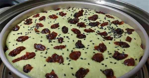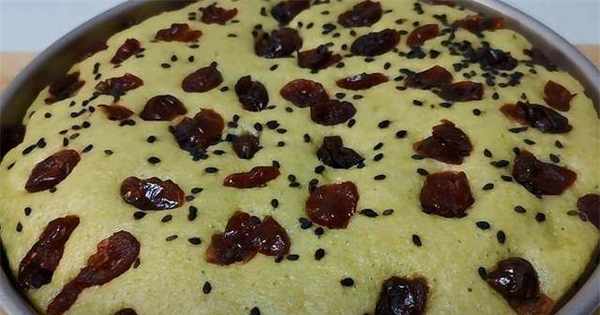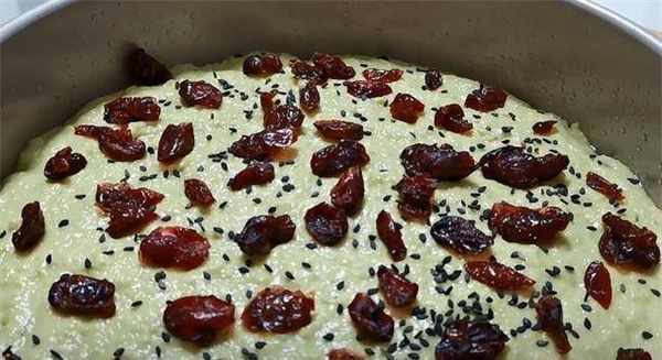 5.准备好模具,在底部和侧面抹上一层油防粘,然后撒上一些煮熟的芝麻提味,也更容易脱模,然后倒入豌豆糊,用勺子舀面糊表面,铺上蔓越莓干或葡萄干,最后撒上熟芝麻,盖上盖子发酵至两倍大,约40分钟。