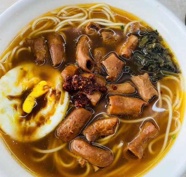 大肉煮得很软烂,吃起来一点儿也不费劲。这家店铺的大肉和其它店铺相比,有一个很大的区别,那就是每一块肉都有脆骨,嚼起来又香又脆,非常过瘾,不知不觉两片肉就吃完了。