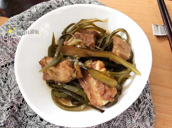 2,改小火慢炖约40分钟,排骨已经熟了,水分已经不多,倒入海带,加盐调味,稍炖10分钟即可。