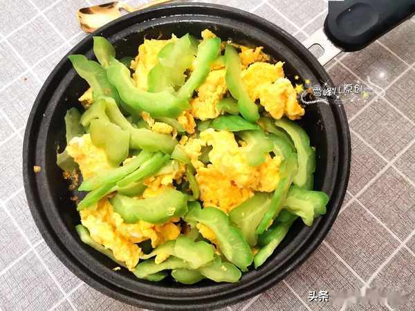 苦瓜炒蛋的做法:食材:苦瓜1根,鸡蛋3个,大葱少许,盐适量,花生油适量。