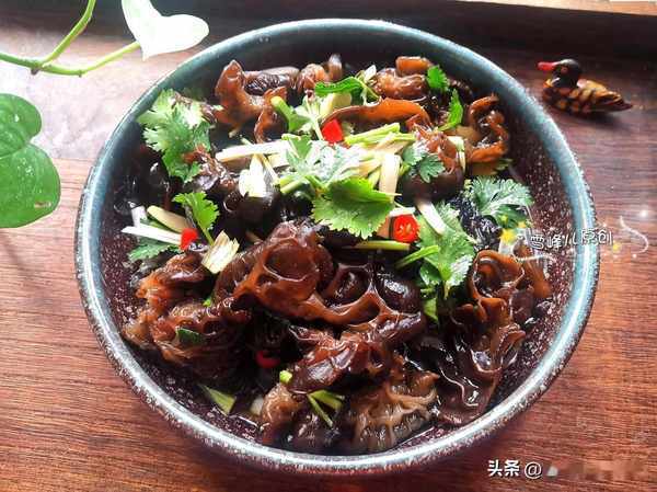 凉拌黑木耳的做法:材料:黑木耳、绿芥茉、小葱、香菜,盐、味精、生抽、醋,小米辣。