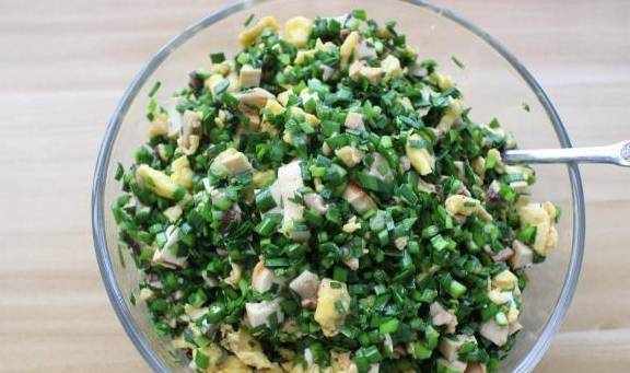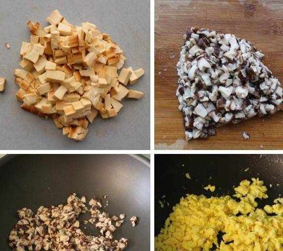 1.包饺子剩下的馅儿,做法之前写过。调馅:豆腐干切碎,香菇切掉根蒂,用热水焯烫后切碎,焯过水的香菇水分较多,我们把香菇末倒入平底锅中烘干水分,这样饺子馅就不会出水了。3个鸡蛋打散倒入热锅中炒熟,捣成小块备用。