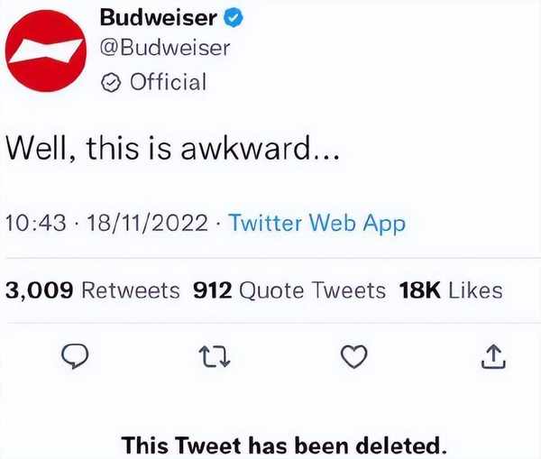 百威当天在社交媒体发文回应,“好吧,这就有点尴尬了。”随后又将此条博文删除。