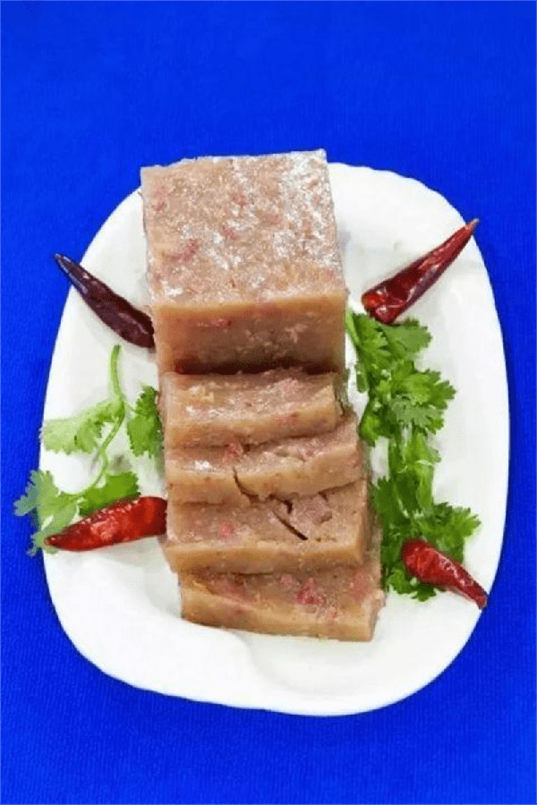 西河肉糕起源于深泽县西河村,是深泽县最为著名的小吃烧饼裹肉的主要原料。西河肉糕以红薯淀粉、驴肉为主料,驴油、香油为辅料,以多种调味品为佐料。将驴肉剁成肉馅,用煮肉的老汤将淀粉、肉末、油一并调好,加入调料,上锅蒸制而成。具有柔软而有弹性、滑嫩鲜香而不腻、老少皆宜的特点,是宴请宾客必不可少的名吃。