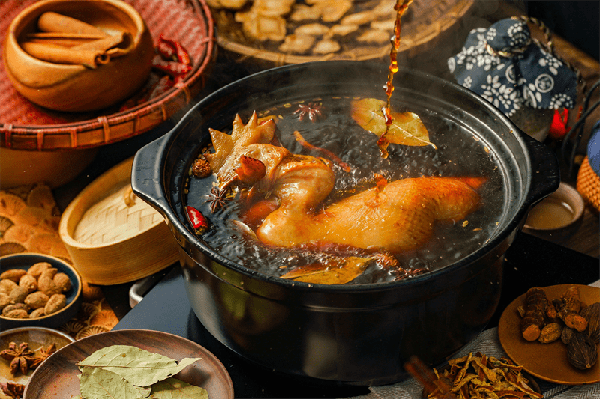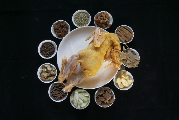金凤扒鸡采用独特的制作工艺,经十二道工序精制而成,所用原料均为生长期450天以上的健康蛋鸡,制成“恭卧状”造型(双翅衔于口中,双腿卧入腹腔),周身涂抹蜂蜜后入油锅炸至金黄色,再用老汤佐以十八味辅料焖煮十四个小时以上(其中不添加任何防腐剂),具有炸得匀、煮得久、焖得烂、易脱骨、色形美、香味厚的特点。