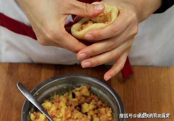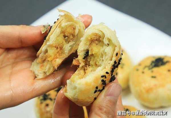的老婆饼就烤好了,用手轻轻一握酥得掉渣,掰开看一下老婆饼的里面,层层酥脆,肉松更是松软可口。