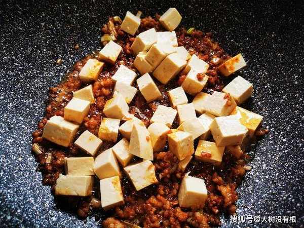 7、倒入豆腐块一起翻炒,老豆腐比起嫩豆腐来说,更适合炒着或者炖着吃,它不容易烂掉,而且豆腐经过汤汁的浸泡特别的入味。