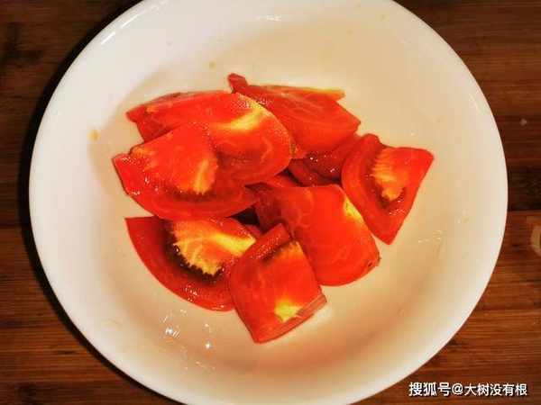 2、准备一个西红柿洗净,切成小块,放碗中备用。西红柿的营养价值很高,而且口感酸甜,适合生吃或者炒食,也是夏天我最喜欢吃的“水果”之一,可以补充肌肤的水分,消除多余的脂肪堆积,令你保持好身材和好看的皮肤,有着不错的减肥和美容的作用。