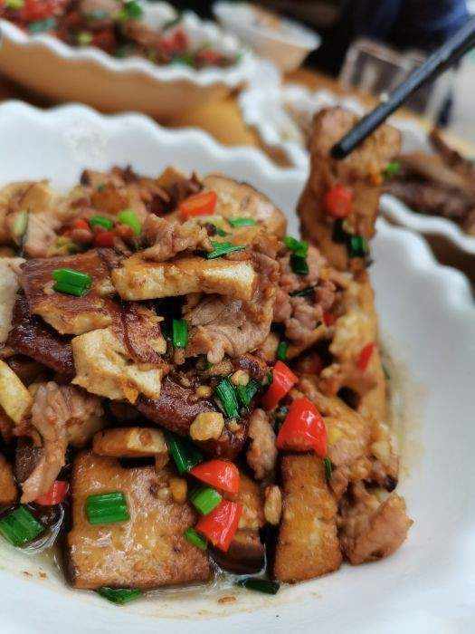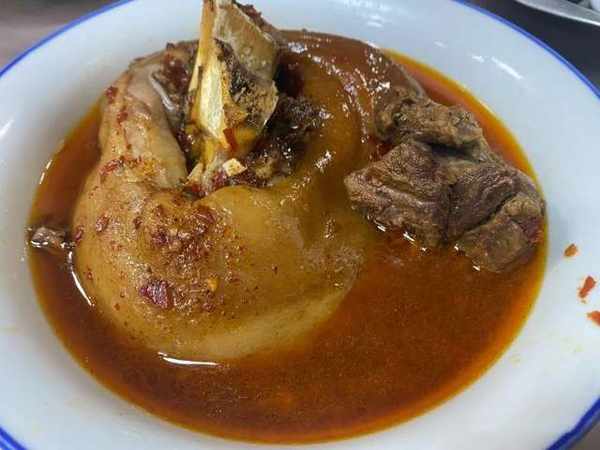 肘子,属于地道的家常菜做法,整个猪肘子用简单的干辣椒粉一起蒸制,原汁原味,猪油油脂的汤泡米饭真是一绝,肘子的口感是肥硕相间,口感肥糯。