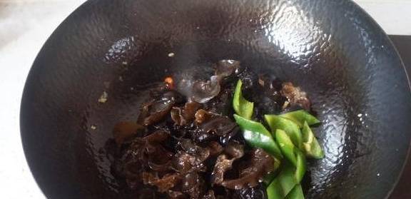 5.放入木耳和青椒快速翻炒至断生,大约半分钟。