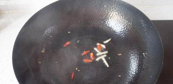 4.锅中另外倒油加热,放入小米辣和姜丝炒出香味。