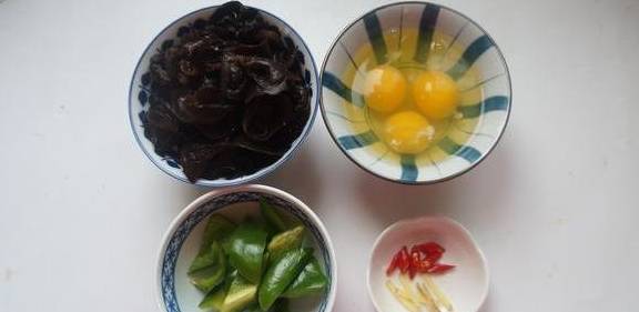 2.黑木耳提前泡发,摘去根部,撕成小块备用。青椒切片,生姜和小米辣切好,鸡蛋打散备用。