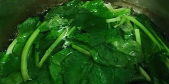 5.菠菜用开水烫一下,取出放入凉水冲凉,捞出沥干水份备用。