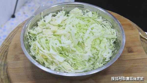 包菜一个从中间切成两半,切去根部,然后切成细丝,同样把另一半也切成细丝,放在盆中用清水浸泡。