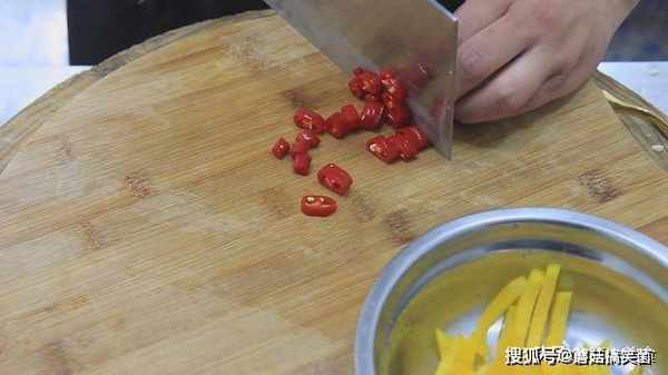 彩椒一片切成辣椒丝,红线椒一个,切成辣椒圈不但出味,还能用来配色。