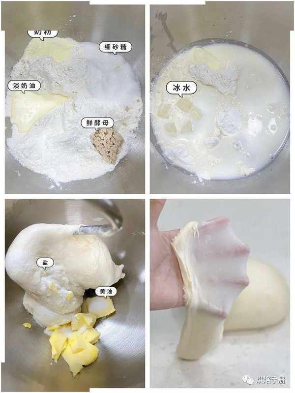 将除黄油、盐外的所有食材搅拌至扩展阶段(厚膜),加入软化的黄油、盐继续搅拌至手套膜