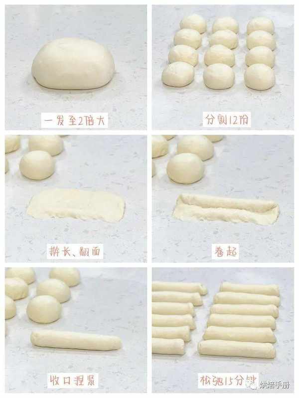 ·发酵好的面团分成12份(约80g/个),滚圆、擀长、翻面,由长边处卷起,松弛15分钟