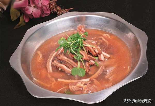 2、然后将牛肉、牛杂放在砧板上分别改好刀,码入垫有熟豆芽的不锈钢锅内,放在左侧的小电磁炉上,再从不锈钢壶内倒入卤牛肉的原汤烧沸,即可由服务员端上桌;青菜、菌菇类涮品则可自助盛入小盘端上桌。