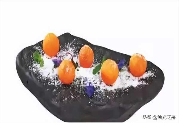 4、客人点菜时,取出红薯球装盘,再取出泡红薯的糖水放入锅内,再放回橙皮丝,小火熬至糖水浓稠,出锅浇在红薯球上即可。
