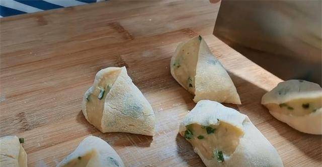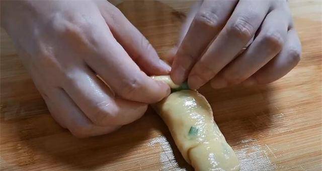3、放在案板上,面皮不要拆开,直接把面皮揉成长长的,用刀分成大小一样的面皮。