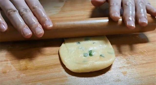 6.时间到了,面团很软,把多余的油倒在案板上,摊开,取一点面团,用手擀一下,用擀面杖擀一下,擀成牛舌状,然后我从下面轻轻转动它,用手按下它,然后从另一端转动它。