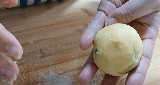 2、将250g糯米粉放入碗中,加入葱花,一茶匙盐,加水尽量多,用筷子搅拌均匀,加入30g玉米油搅拌至呈絮状。软面团,像这样揉。