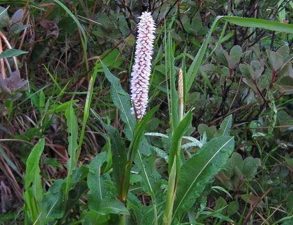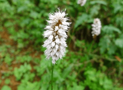 它的根部采挖出来的时候,可以见到像是老人弓着腰一样的形状,所以在农村才被称为“弓腰老”。叶片是茎秆都是直立生长的植物,叶片宽大,边缘是不规则的形状,圆柱形的花穗,在山林中独树一帜,是由无数纯白色的小花点缀而成的。它的茎秆上有细密的棱角,结出来的果实也是三角形的,深黑色,看上去和种子一般。