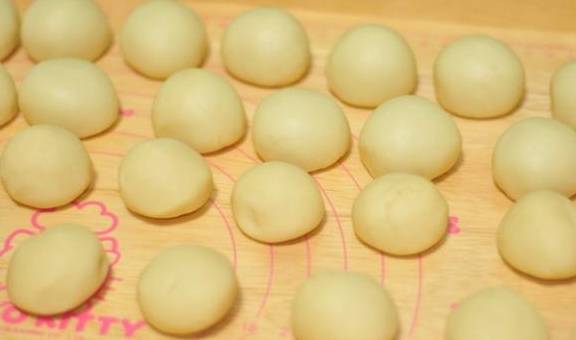 6.将两种面团盖上湿布,醒20分钟,各分成17等份,搓圆