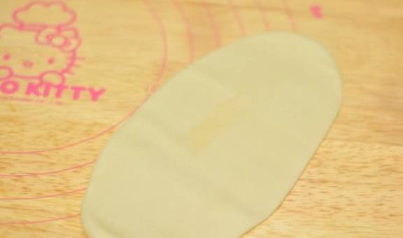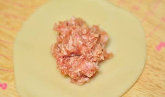 10.长条压扁,团成团,擀成圆饼,包上猪肉馅。捏成团。