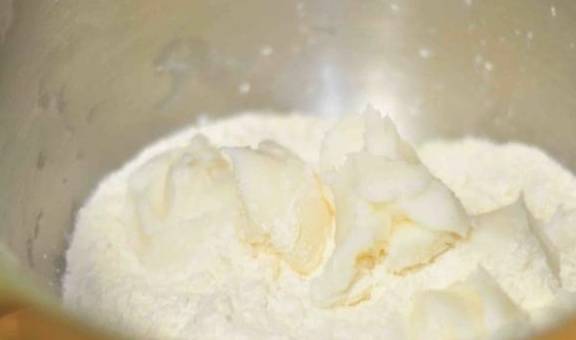 5.分别将油酥皮(面粉340克+猪油120克+水150ml)和油酥(面粉280克+猪油150克),放入厨师机搅拌揉匀成软硬度差不多的光滑的面团。