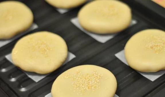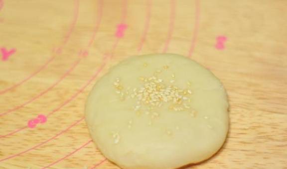 11. 收口朝下,轻轻压扁。撒上白芝麻。