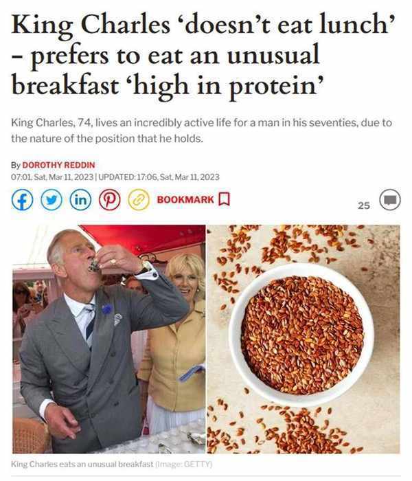 王室传记作家蒂娜·布朗在她的《宫廷文件》一书中证实了这一说法。布朗表示,在海格罗夫庄园吃早餐时,查尔斯的长子威廉王子曾在自助区提醒其他客人,和国王的“亚麻籽早餐”保持距离,并称这种食物就像是“鸟食”。