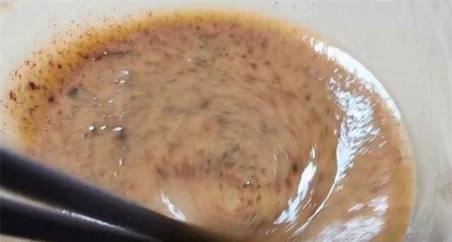 5、然后做糕点,准备40g玉米粉,加入2g五香粉,5g盐和胡椒粉,用筷子搅拌均匀,再倒入60g热油炸,搅拌均匀,拌匀,加入一勺豆浆,搅拌均匀,备用。