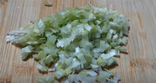 6、准备一根大葱,用刀敲一下,激发出大葱的香味,然后对半切开,先成葱花,再成葱末。