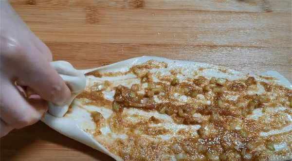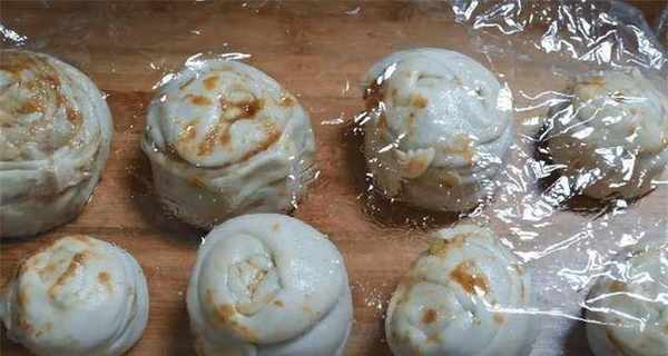 8.面条刚醒。把多余的油倒在案板上,取出一块面团,用手压扁,用擀面杖擀宽。均匀的卷起来,这样在拉伸的同时,这样做出来的蛋糕层次很多,醒发的面团非常有弹性。