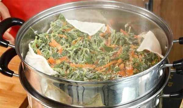 4、蒸锅上铺上粗棉布,将拌好的紫花苜蓿放入,大火煮20分钟左右,取出放入锅中待用。