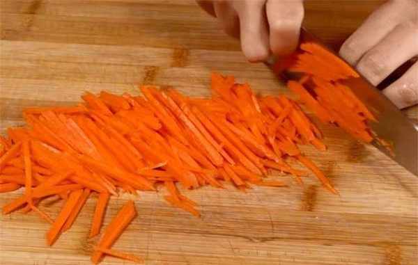 3、然后用粗棉布包好揉至干,放入碗中,撒上胡萝卜丝,撒上一勺面粉用手盖均匀,像这样。