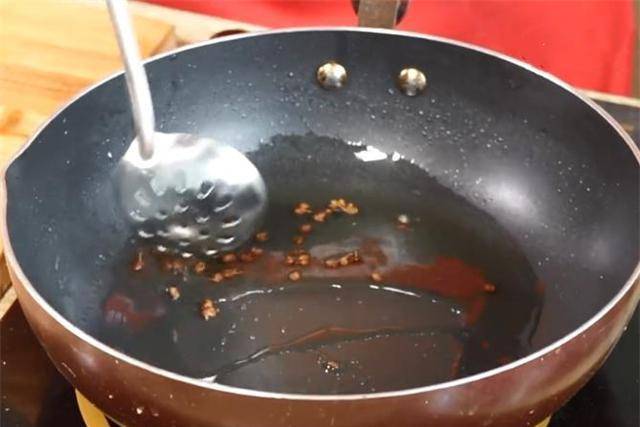 6、锅内倒入油,加入花椒粒煸炒,油少时,油热时,捞出花椒,改小火稍等片刻下油。