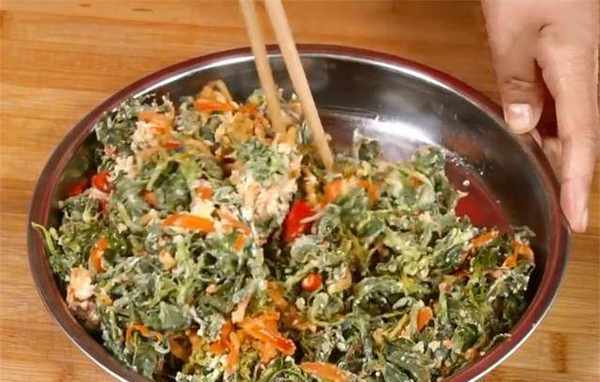 7、将苜蓿南瓜用盐调味,加入蒜末和小米椒,淋上一勺意大利辣香肠油,加少许酱油用筷子拌匀。
