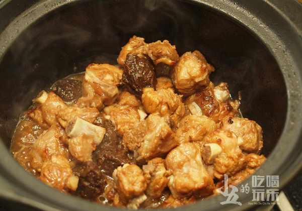 5. 将炒好糖色的排骨用筷子夹出来放入砂锅中,放入话梅,放入开水,大火煮开,转小火煮30分钟左右。(记住,不要将汤汁一起倒入砂锅中)