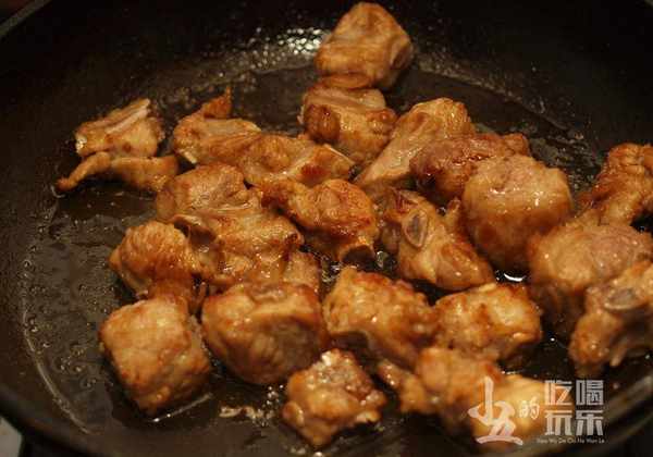 4. 下排骨,继续用中小火,将排骨慢慢翻炒至上糖色,耐心点,炒上3-5分钟。